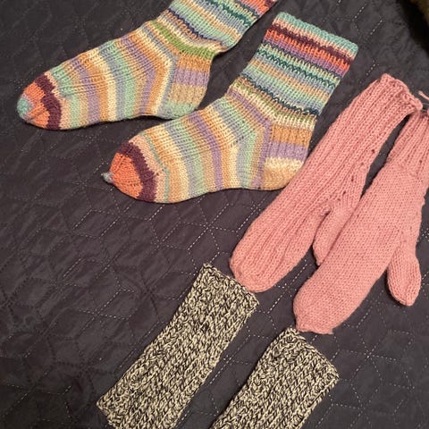 Käsinneulotut, ruskea-valkoiset, aitovillaiset, paksuudeltaan muhkeat lapaset. Ostettu Käsityöliikkeestä - ammattilaiskudontatyönä.