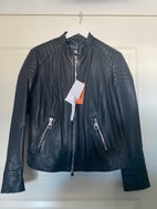 Myydään naisten BOSS Orange Junique nahkatakki. Pehmeää aitoa nahkaa. Koko: 44. Mitat, kainalo-kainalo 55 cm, olka-helma 55 cm. Väri: OPEN BLUE, todella tummasininen, melkein musta. Käyttämätön ja laput vielä kiinni. (Ovh 449 euroa)