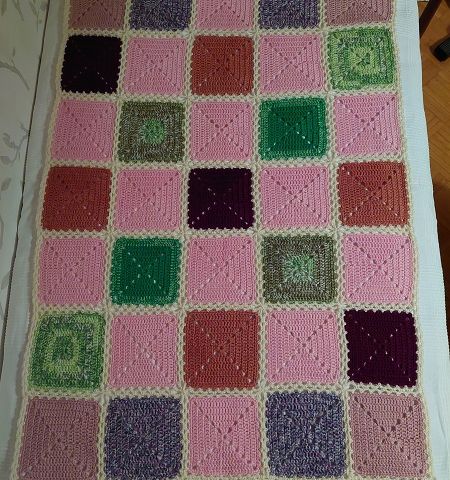 Puuvillalangasta virkattu torkkupeitto. Koko 90 x 105