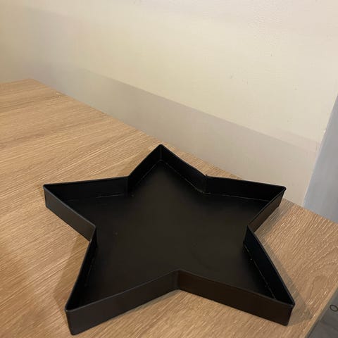 Musta tähtialusta kynttilöille, tarjoiluun, koruille tai muulle pikkutavaralle. Metallia.