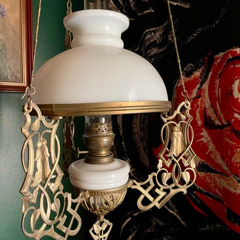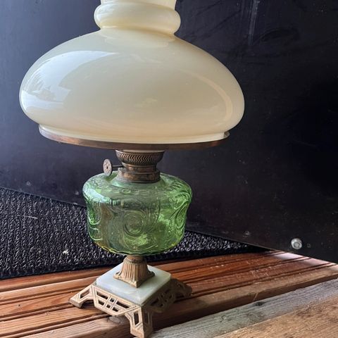 Vanha öljylamppu mikä on sähköistetty, ostettu antiikkiliikkeestä -78 mutta ikää on huomattavasti enemmän. Mahdollista muuttaa takaisin öljylampuksi.