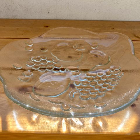 Myydään upea, vintage, Humppilan lasin hedelmävati. Design Kaija Aarikka. Signeerattu: Kaija Aarikka Humppila Finland. Halkaisija noin 36 cm, korkeus noin 6 cm. Hedelmävati on ehjä ja hyväkuntoinen.
