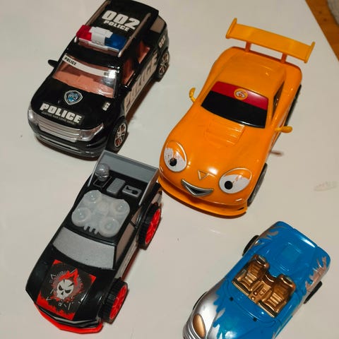 Hieno rata kahdelle autolle. Autot tarvitsevat patterin ja kulkevat sitten itsestään radalla. Patterit eivät tule mukana. Mukaan tulee muutama liikennemerkki ja mäki. Tykätty lelu, rataa voi muunnella helposti.