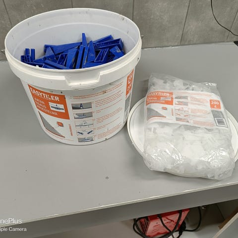 Asennussarja sisältää 100 kiilaa (kertaalleen käytettyjä n.puolet) , 200 asennuspalaa (uusia) ja asennuspihdit.