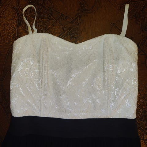 Kerran käytetty mekko, jossa olkainosa pitsiä ja selkä avonainen. Rypyssä säilytyksen jäljiltä. Mitta kainalosta kainaloon n. 42 cm.