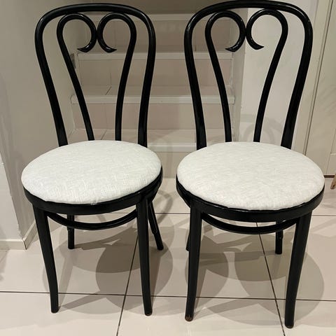 Retro- ja vintagehenkisen sisustamisen ystävät huomio! Neljän tuolin sarja klassisen mallisia wieniläistyyppisiä tuoleja vailla uutta kotia. Kaikki tuolit ovat samaa mallisarjaa. Tuolien rungot oksidoitua, kullanväristä pyöreätä metalliputkea, istuinosat kangaspäällysteistä kalustelevyä. Mikäli istuinten kuosi ei miellytä silmää, ne on helppo verhoilla uusiksi halutessaan. Itselläni oli tarkoitus vaihtaa tuoleihin mustat verhoilut, mutta ajan puutteen vuoksi se jäi. Laitetaan siis tuolit kiertoon. Tällä suositulla tuolimallilla on monta nimeä, kuten bistrotuoli tai kahvilatuoli. Tuolit ovat ehjiä, tukevarakenteisia ja hyvässä käyttökunnossa. Siistikuntoisia, mutta kultainen väri on osittain kulunut selkänojan yläosasta, josta tuoleja on nosteltu. Ei juuri kuitenkaan erotu, koska alla on kromattu pinta. Mukavat tuolit istua, vaikka pidempäänkin. Tuolit ovat mitoiltaan: