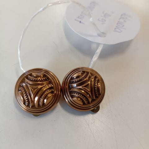Pronssiset Kalevalakorun korvakorut 949, 40eur+ mahdolliset lähetyskulut. Kuvassa, jossa kumpikin koruu takaa, valon suunta vaikuttaa väriin. Korut ovat saman väriset myös takaa.