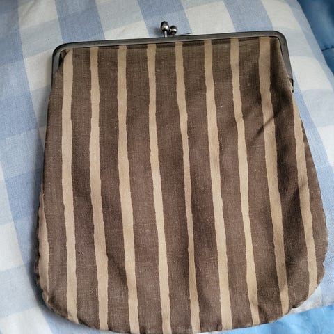 Pussukka, joka on itseommeltu Marimekon Kristina Lepon suunnittelemasta Näkki (1981)kankaasta. Nauha katkaistu. Koko 18x16 cm.