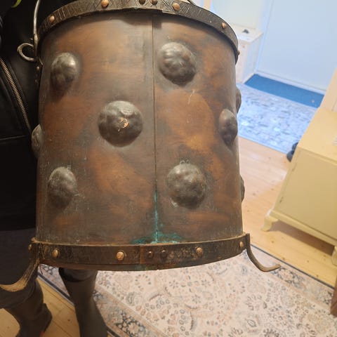 Lampun alaosa, kupari, korkeus n.12cm, pohjan halkaisija n.6cm, yläosan aukon halkaisija sisämitta n.4cm, ajan patinaa.
