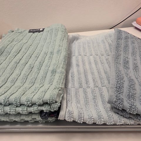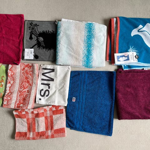 Kaksi lilan väristä käytössä ollutta pyyhettä. (Hieman haaleampi väri oikeasti kuin kuvassa).