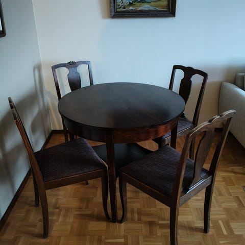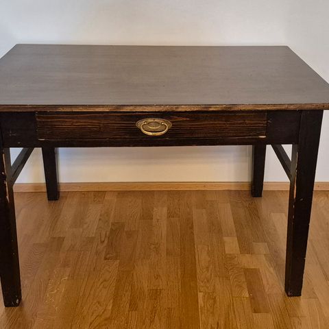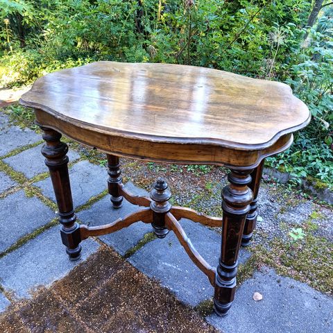 Vuosisadan 1800-1900 vaihteen "herrain tupakkahuoneen" tamminen pöytä, jolta pruukattiin tarjoilla sikaareja, tupakkaa ja konjakkia/wiskiä yms. Kuparinen kansi on irrotettava tarjotin. Pohjassa valmistajan tiedot*) paikkakuntineen Ruotsissa (Googlessa tietoja O.E.Ekelundista ja tunnetusta firmastaan)- ja lähetysosoite Tukholma, josta se kulkeutunut huusholliini n. 30 v. sitten. Harvinaisempi pöytä soveltuu nykyisin mm. miesluolaan, mutta yhtä hyvin naisten kahvittelupöydäksi, kukkapöydäksi, apupöydäksi tarjoilussa yms., eteisen "vastaanottopöydäksi", jolle laskea käsilaukku tai kauppaostokset takkia riisuttaessa. Kokonaisuus ikäänsä nähden hyvässä kunnossa - toki kuparikantta voi kiillottaa ja puuosia öljytä niin halutessaan - luksusta. Pöydässä ei ole hajugaittoja - ollut käytössä suuren salin tarjoilussa apupöytänä. Katso pöydän koko 6. kuvan kuvatekstistä Hinta 330e.
