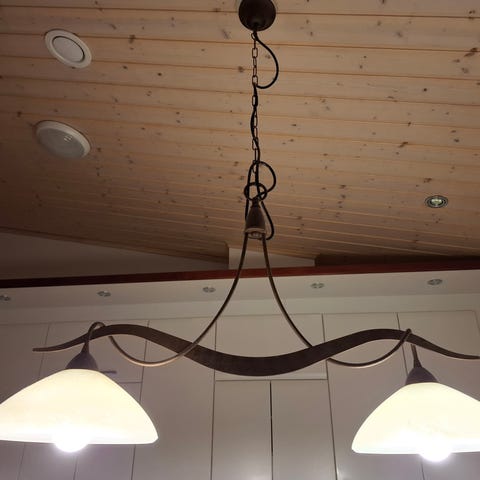 Tyylikäs ja pelkistetty kattolamppu etsii uutta kotia. Lampun varjostimet ovat lasia ja metalliosat harjattua terästä. Sopii esimerkiksi ruokapöytää valaisemaan tai olohuoneeseen.