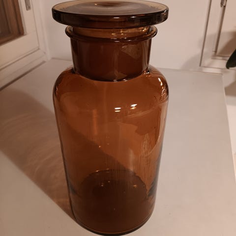 Nyt tarjolla tosi isoja apteekin astioita! Iso pullo sekä kannellinen purkki. Mitat piirroksessa. 35 EUR kpl