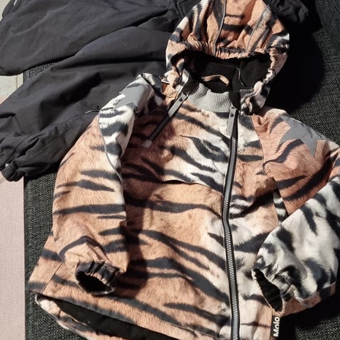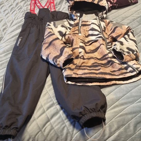 Väri tasaisen tummanruskea, ikkunasta tuleva valo vähän vääristää paikoittain. Ei haalistunut, heijastimissa kulumaa ja polvissa vähän pehmentymää. Edessä nappirivistössä pieni 1mm nirhauma. Täysin ehjä ja puhdas muuten. Erittäin hyvä vielä käyttöön. Toppatakki, toppahousut, talvitakki, talvihousut.