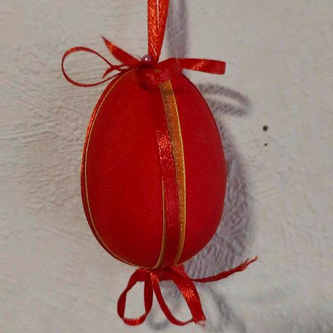 Keraaminen ruskeasävyinen muna ripustusnarulla. N. 4,5 x 4 cm.