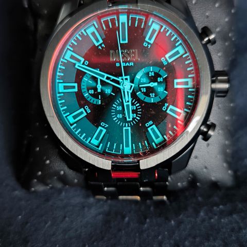 Hienokuntoinen Diesel rannekello. Halk. 55mm nupilla, vesitiivis 100, lugi 26mm, uusi paristo. Mukaan paperit ja alkuperäinen kotelo.