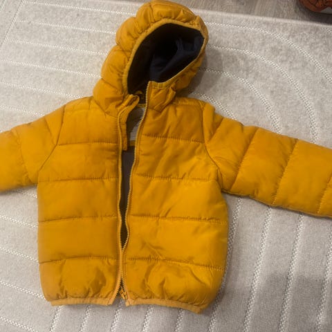 Muhkea karvakauluksinen poikien toppatakki, tekonahkasomisteet hartioilla ja taskuissa. Edessä vetoketju ja tuulisuoja. Helmassa ja hihansuissa kuminauhat. Koko92.