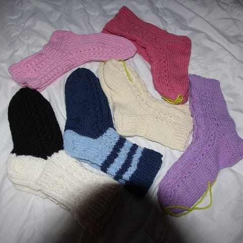 Kuvanmukaiset kudotut villalangasta palat peitteeseen tmv. Koko kasa uuteen kotiin. Reilun kilo painoa.