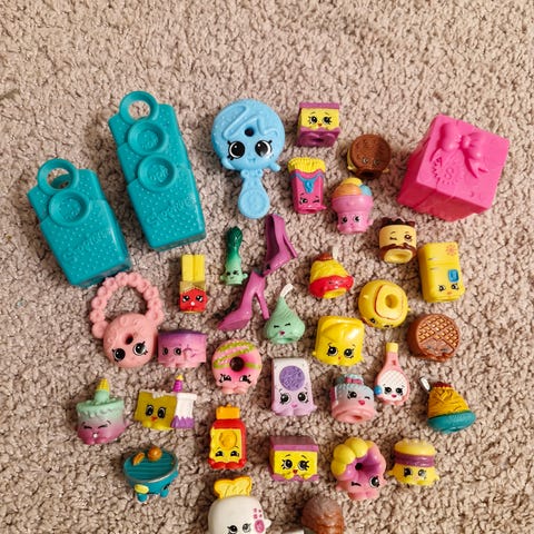 3. 7 shopkinsiä, laatikko, pinottava hylly ja reppu, 10 eur