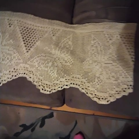 Kaunis valkoinen rullakappa jossa beiget kuviot. Tankokuja.