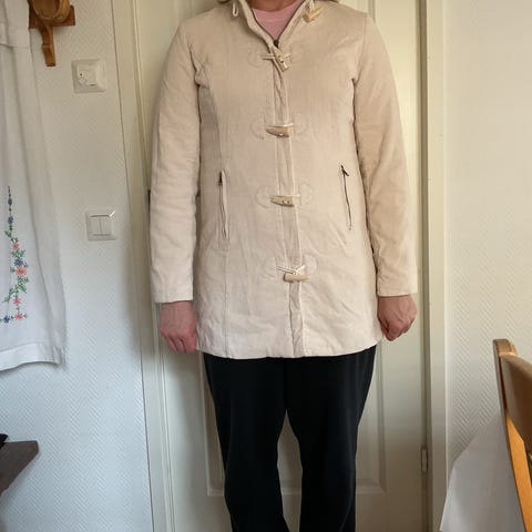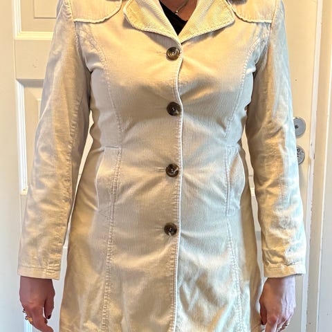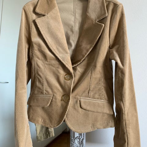 Beigenvärinen, samettimainen pinta. Kaulus ja hihansuut neulosta, koko lapussa L. Pientä kokoa, joten sopii koolle M. Siisti ja ehjä.