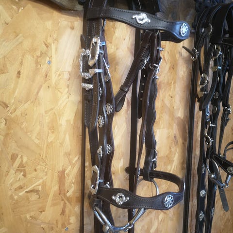 Mydään Full kokoiset tumman-ruskeat/hopea nahkaiset akateemiset barokki suitset. Otsapanta 42 cm. Ohjat seuraa mukana.