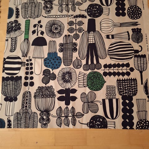 Kuvan Marimekon "puutarha" kangas, suunnittelija Kristina Isola, tätä löytyy muutama metri. Hinta 30 euroa/metri. Voin postittaa.
