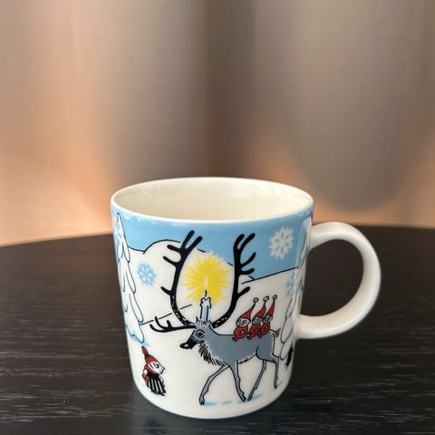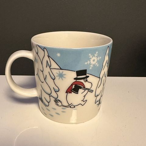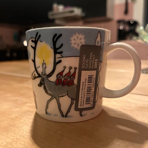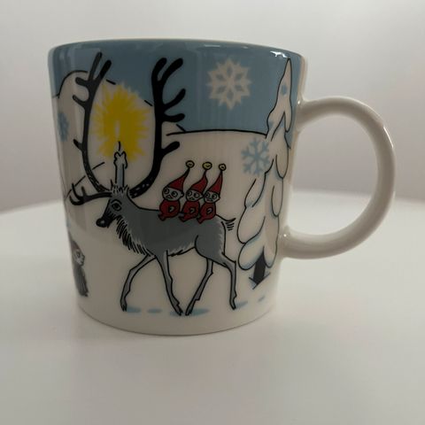 Myytävänä uusi ja käyttämätön muumimuki talvimetsä (2012). Mukissa on tarra paikallaan. HUOM! Kuvan talvinuotio-muki on myyty.