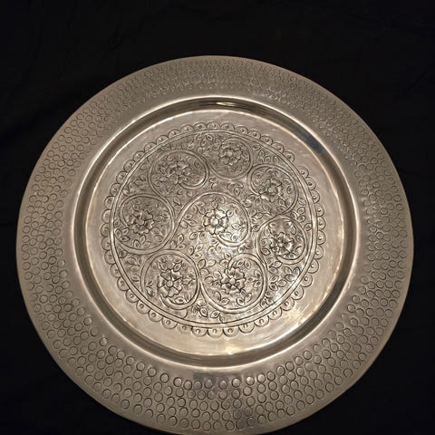 Metallinen tarjotin, päällä hiukan kulumaa. Halkaisija noin 31cm.