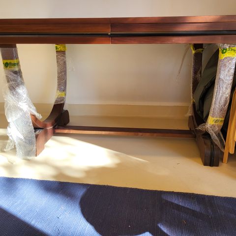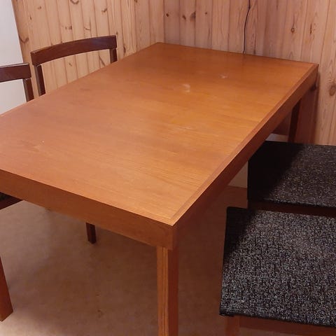 Askon 8 hengen ruokapöytä ja tuolit. Arviolta 30 luvulta. Pöydässä irroitettava jatkopala, tuoleissa osa hieman eri värisillä päällysteillä, mahongin punainen, ruskea. Pituus 140, jatkopalan kanssa 170. Leveys n.90 ja korkeus 70. Alkuperäiset. Tarjouksia otetaan. Vain nouto.