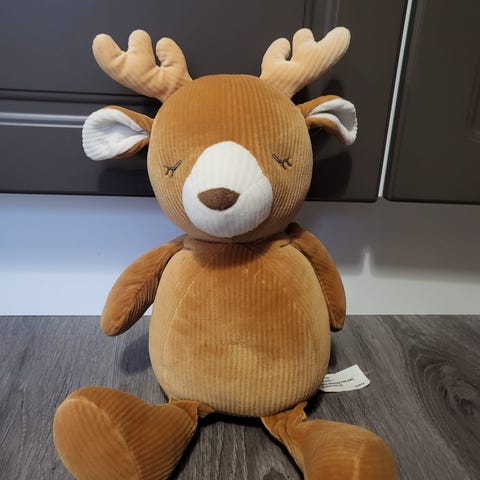 "-Done by Deerin norsun muotoinen soittorasia on valmistettu raidallisesta puuvillakankaasta.