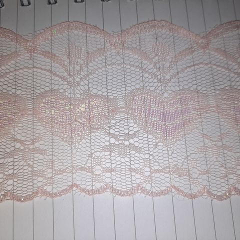 Valkoinen pitsi polyesteriä. Pituus vähintään 430cm . Korkeus noin 32-37 mm.