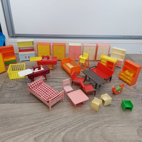 Miniatyyri esineitä mm.sohva, nojatuoli, ruokapöytä ja tuolit
