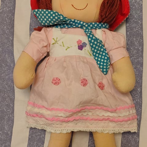 Hinta postitettuna 35 euroa. Käsityönä tehty pehmo nukke sekä hame, tossut, housut ja kauluri, pituus 48 cm,