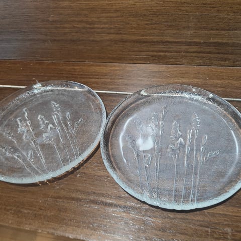 Kirkkaat lasilautaset huurretulla ruusukuviolla. Hyvässä kunnossa, yhdessä lautasessa pieni vekki reunassa ks. kuva.