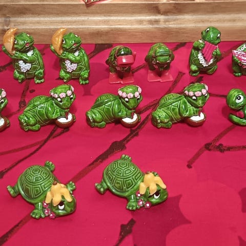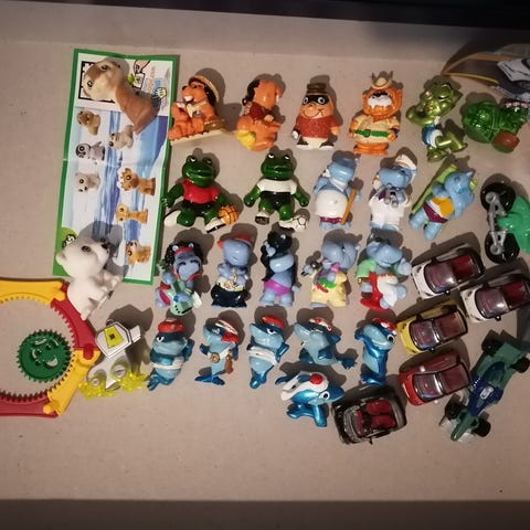 Hyväkuntoisia kinder leluja keräilyyn. Kilppareita ja koiramainen hahmo.