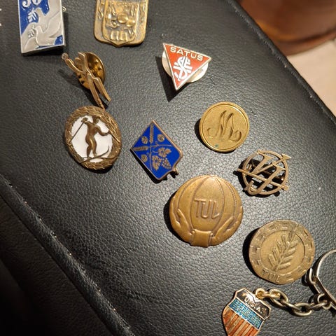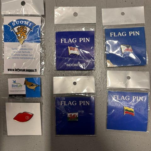 Myydään yhtenä eränä seitsemän maa- ja kaupunkiaiheista pinssiä ja rintaneulaa. Kunto vaihtelee erinomaisesta tyydyttävään.