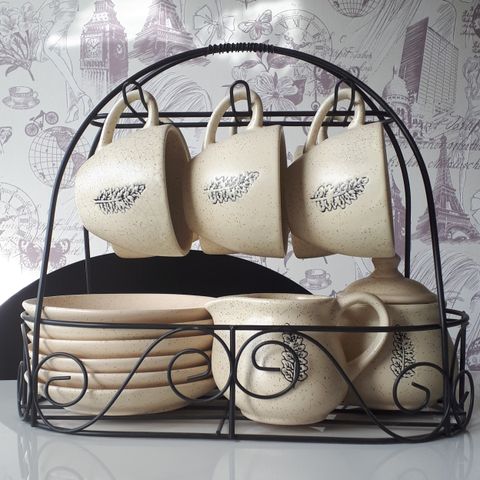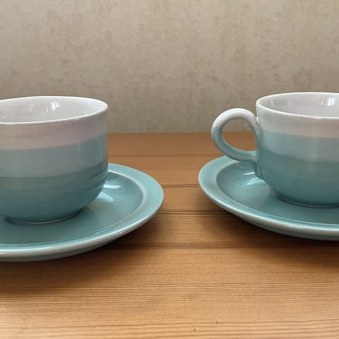 Kauniit valkoiset kultareunuksiset kahvikupit tasseineen.