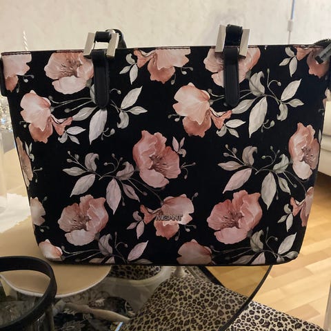 Pieni käsilaukku säädettävällä olkahihnalla. Kukkakuviointi. Vähäisellä käytöllä ollut, vaikkakin itselle mieluinen. Keinonahka hieman alkanut halkeilemaan vetoketjun ympärillä ja saumakohdissa, muuten olisi ihan priimakuntoinen.