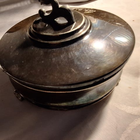 Jostain metallista sydän rasia 1960 luvulta. Saranan vieressä pikku lohkeama. Koko 7x7 cm. kork. 4 cm. Nouto tai postitus 8,90€