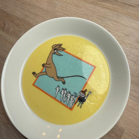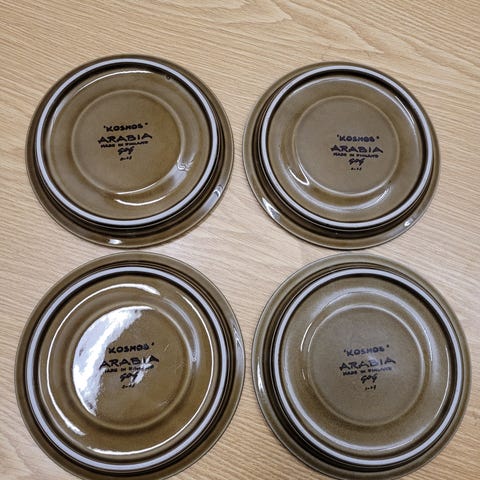 Raidat hieman haalistuneet. Jokaisessa lautasesta pieni pala pois alapuolelta reunasta, kuvassa esimerkki. Ei näy päällepäin. Ja kahdessa lautasessa jonkin sortin likaa lasitteen päällä saattaa saada hinkattua pois. Yhdessä lasitesärö.