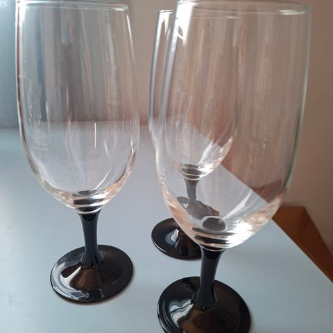 Mustajalkaisia, valkoviinilaseja, Luminarc, Domino. Lasien tilavuus 19cl, ovat käyttämättöminä säilytetty neljän kappaleen pakkauksissa.