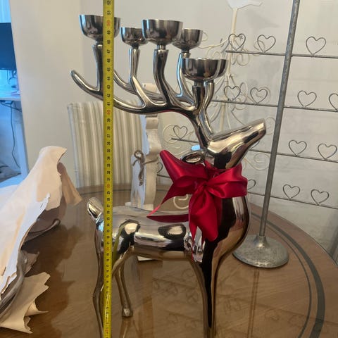 Kuvan mukainen poro johon saa kynttilän sisälle. Kokonaan metallia ja kyljessä luukku josta kynttilän saa laitettua sisään.
