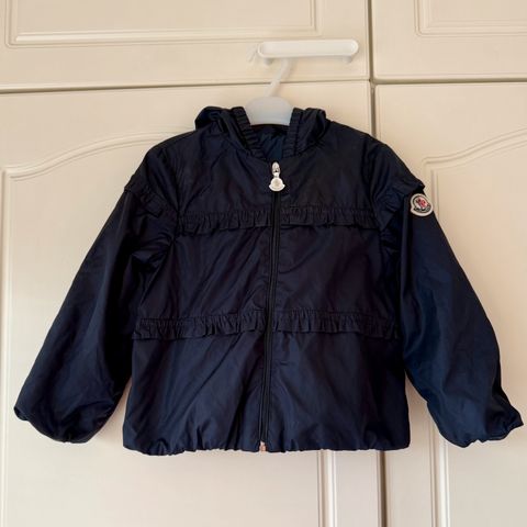 Tummansininen tuulitakki kevyellä vuorilla. Hyvä kunto muutamaa yksityiskohtaa lukuun ottamatta: alimmassa nepparissa pientä kulumaa sekä vetoketjun vetimessä (kts kuvat). Irroitettava huppu.