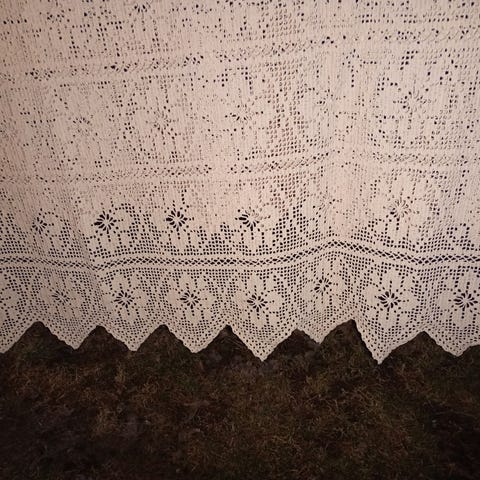 Harmaa pehmeäpintainen kangas, jota käytetty päiväpeittona. Kantattu punaisella kiiltävällä/kahisevalla kankaalla.
