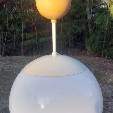 Retrohenkinen jakallinen valaisin, musta runko, huurrutettu lasi varjostimena kasvikuviolla.