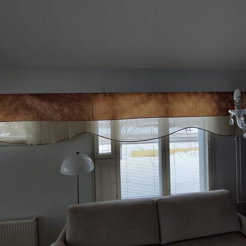 Myydään tosi vähän käytössä ollut, siisti, kaunis verhokokonaisuus. Teetetty ompelijalla. Pituus 8,40m ja korkeus korkeimmillaan 70cm. Lisäksi näihin kuuluu myös 1 sivuverhot, joiden leveys on 2,96m ja Pituus 2,10m ja 2 sivuverhot joiden leveys 1,40m ja Pituus 2,10m Sivuverhot on samaa kangasta kuin kapassa oleva kangas. Nyt verhot vaan ripustettu ikkunaan kuvausta varten, todellisuudessa kaunis kokonaisuus.