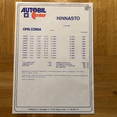 Myyn hinnaston Opel 1991: Corsa, Kadett, Vectra, Omega, Senator, Calibra (EK Auto)