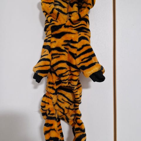 Pikkukoiran lämmin talviasu. Muuten hyvässä kunnossa, mutta resorit hieman kuluneet ja yhdestä lahkeen resorista olen neulonut pienen reiän. Lämmin ja pehmeä fleece sisävuori. Napit ja kiroistysnauha. Mittoja näet kuvista.