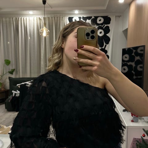Gina Tricot Muut mekot musta naisten mekko, koko 38. Mekossa on paljettikoristeltu yläosa ja kevyt, ilmava alaosa. Materiaalina on pääasiassa viskoosia ja polyesteriä.